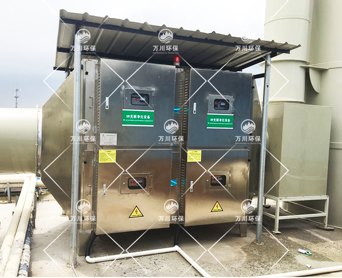 由于廢氣中含有一定的顆粒物,因此廢氣首先進到噴淋塔在進一步除去顆粒物和水溶性物質,而后進入到除霧器,過濾未完全凈化水分,而后進入UV光氧凈化器,最后再進行活性炭吸附裝置,該法具有處理效果高,運行穩定優點。