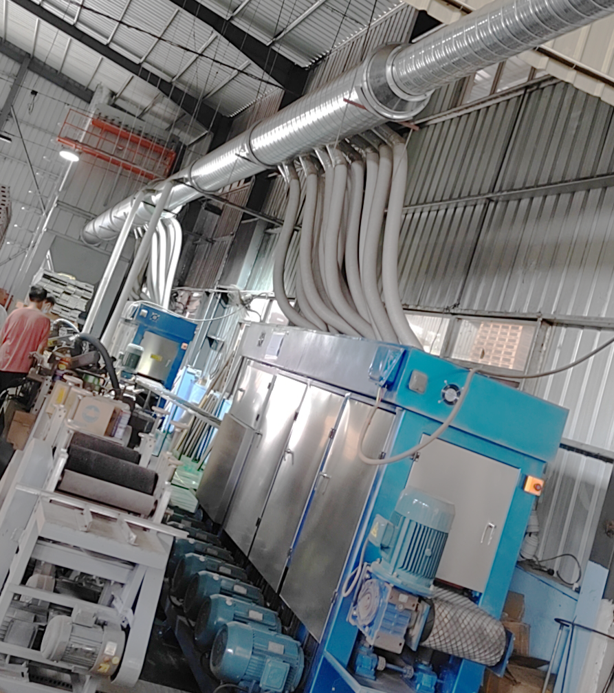 在木塑板生產的過程是要對其表面砂光、打磨處理,會產生大量的粉塵,萬川根據場地與粉塵類型設計了除塵方案與一配套木塑脈沖布袋除塵器。