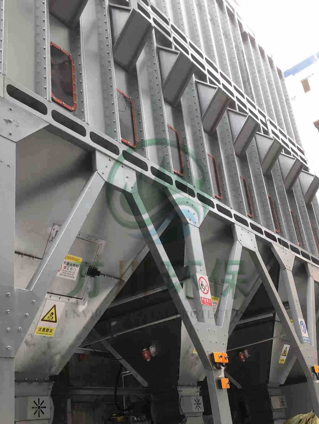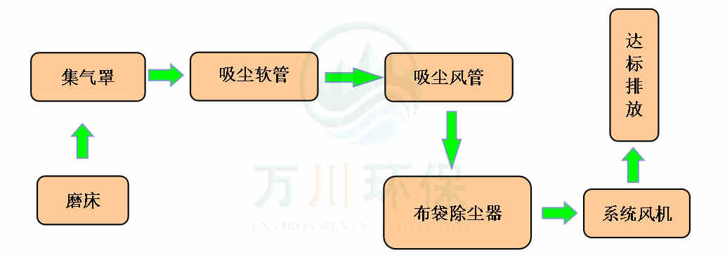 磨床生產時產生的粉塵通過集氣罩、吸塵軟管進入到脈沖布袋除塵器中過濾凈化,粉塵落入灰斗凈化后的廢氣通過系統風機達標排放。