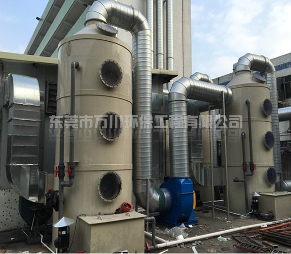 噴淋塔也叫水淋塔,是以水為介質(zhì)處理粉塵。含塵氣體從塔體下方進氣口沿切向進入噴淋塔,在風機的作用下,迅速充滿進氣段空間,然后塔頂位置的噴淋頭向下噴水,水與含塵廢氣接觸,使得空氣和粉塵分離,達到除塵的效果。噴淋塔具有結構簡單、造價低、占地面積小、凈化效率高等優(yōu)點,能夠處理高溫、高濕的氣流,將著火、爆炸的可能減至最低。經(jīng)治理后,污染物排放達到標準:執(zhí)行《廣東省大氣污染物排放標準》(DB44/27-2001)中第二時段一級標準。