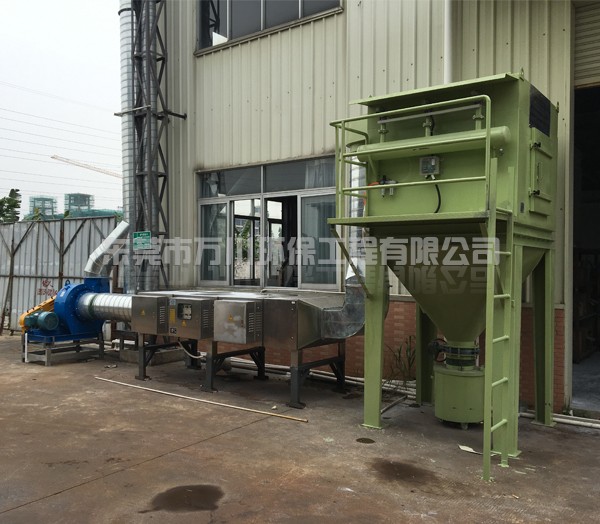華工公司需要處理的污染物是有機廢氣和塑料粉塵,塑料粉塵的特點是顆粒大,自重大。根據(jù)華工公司的實際情況和以往的相關(guān)工程經(jīng)驗,我們工程師采用了“脈沖濾筒除塵器+UV光解凈化器處理”這套工藝。
